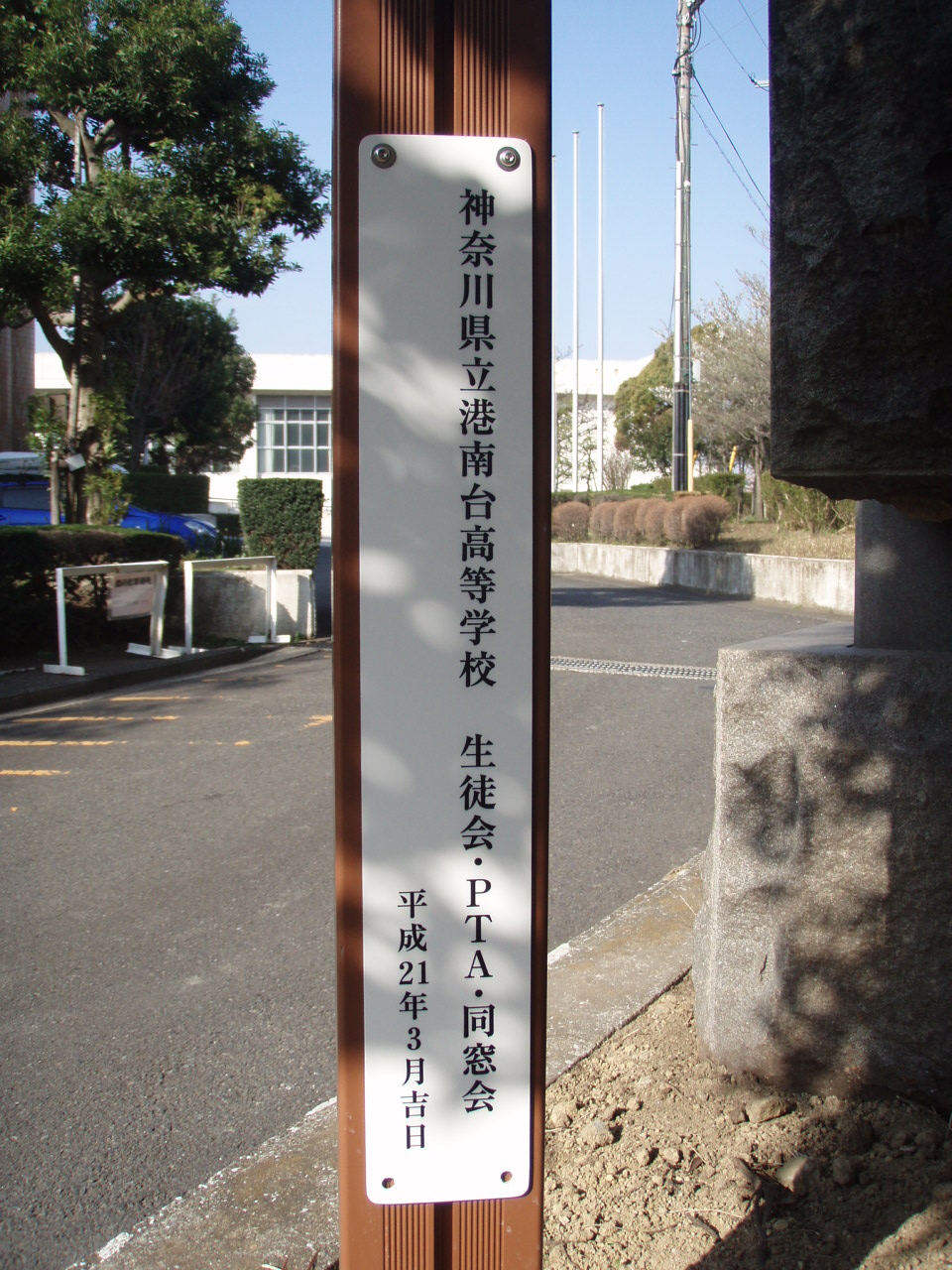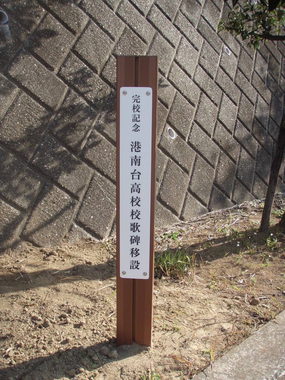 この港南台高校校歌碑は7期生の卒業記念で寄贈されたもので、作詞家 三木卓氏の直筆を彫った貴重なモノです。今回の移設作業のタイミングで、彫った文字を白く塗りなおし、「完校記念 港南台高校校歌碑移設」プレートを新しく作成しました。横浜栄高校に立ち寄る機会がありましたら、ぜひ、ご覧下さい。